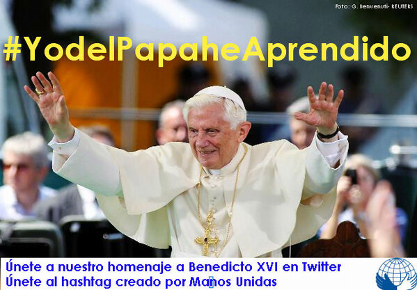 Manos Unidas agradece a Benedicto XVI su apoyo a los más desfavorecidos y sus constantes alusiones a la Caridad en sus mensajes. (Ejemplo de ello son sus Encíclicas "Deus Caritas Est" y "Caritas in Veritate" y el que, probablemente, sea el último mensaje que dedique a los católicos: el de la próxima Cuaresma).